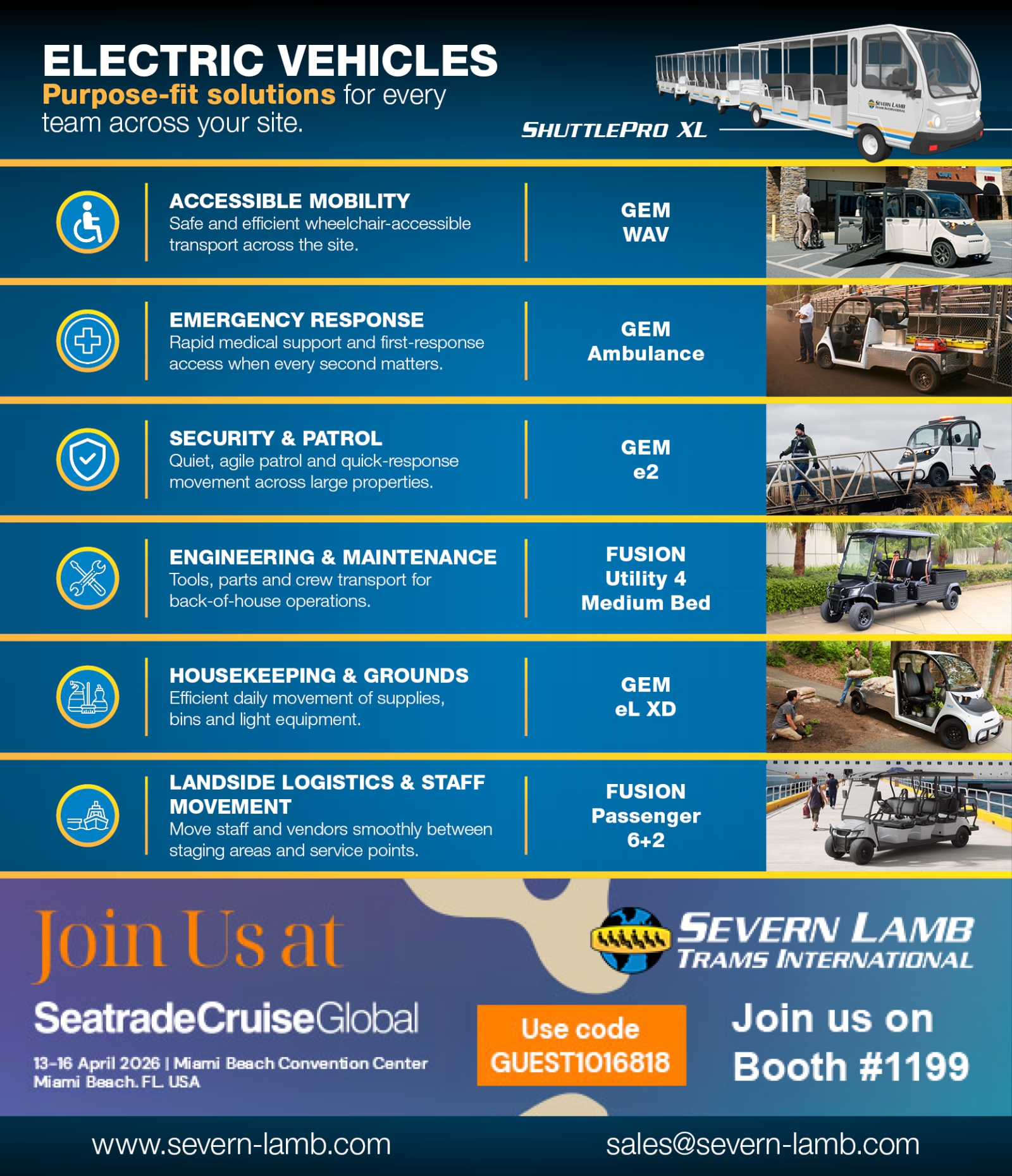Our attendance marks an exciting step for Severn Lamb as we introduce our specialist electric vehicle solutions to a wider cruise and port audience. At this year’s exhibition, we will be showcasing how our vehicles can support landside logistics, operational support, and internal site movement across ports, cruise destinations, terminals, venues, and other large properties.